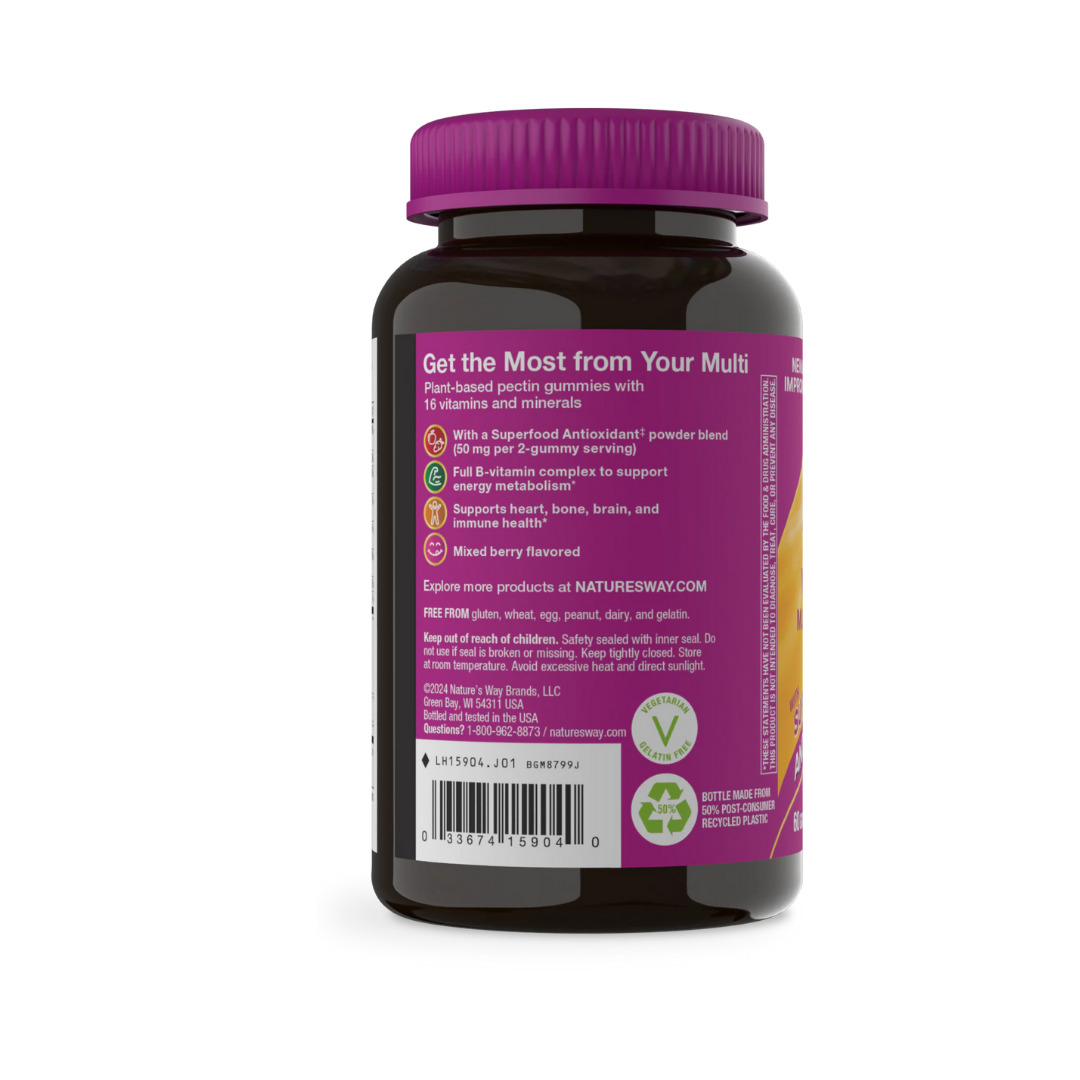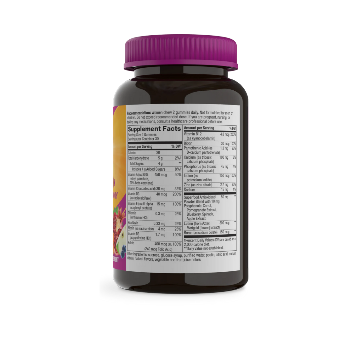 Taking your daily multivitamin should be as delicious as it is beneficial. Women’s 50+ Gummy Multivitamins are specially formulated with 16 vitamins and minerals that support well-being as you age, plus the full B-vitamin complex to help convert food into energy.* Just two gummies a day supports cellular energy, heart health, eye health, immune health, and bone health.* Formulated with a Superfood Antioxidant ‡ powder blend with 10 mg polyphenols per 2-gummy serving, including pomegranate extract, spinach, blueberry, and more.