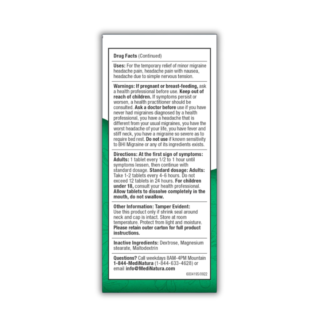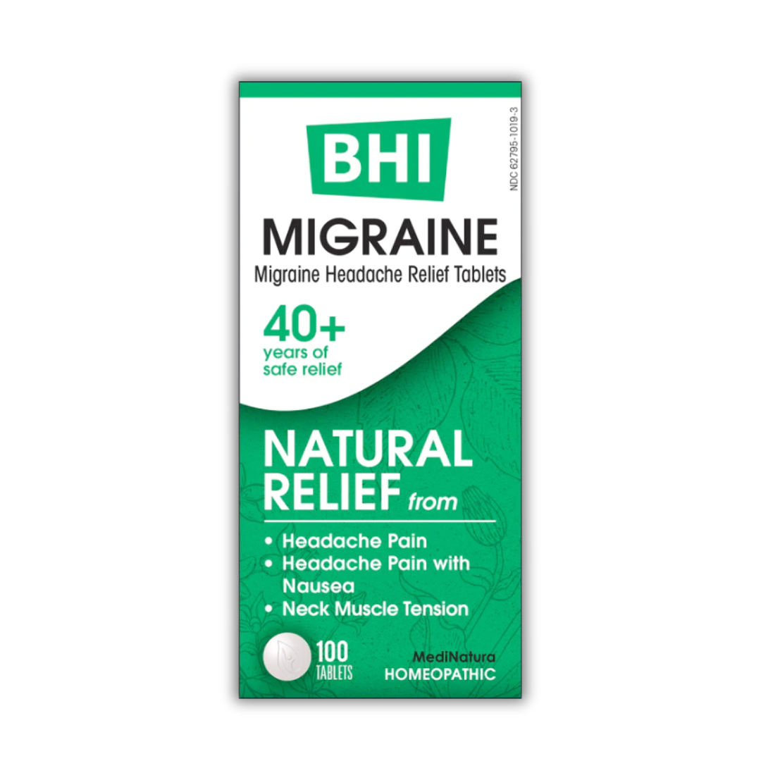 It’s migraine relief in natural form. BHI Migraine Relief tablets tackle migraines homeopathically and naturally. With over 40 years of safe natural treatment, these homeopathic tablets target headache pain, nausea, and neck muscle tension. Pop a tablet at the onset of pain, dissolve it in your mouth, and let the gentle yet comprehensive blend of 17 homeopathic active ingredients thoroughly solve your migraine troubles.