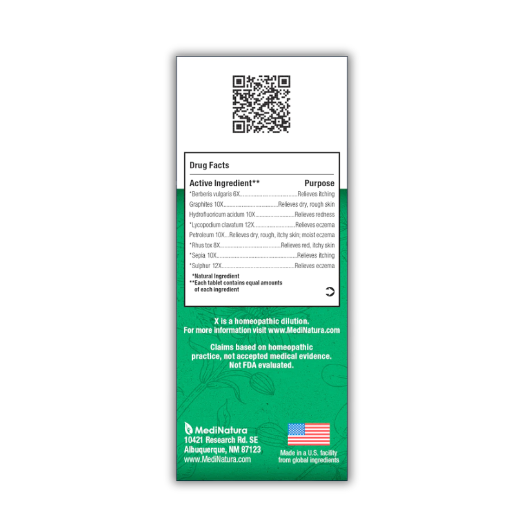These tablets harness the power of homeopathy to provide a natural and safe treatment for eczema symptoms. Homeopathy treats symptoms with micro-doses of multiple active ingredients to stimulate the body’s own defenses. MediNatura’s approach uses a mix of potent actives in varying strengths to give better relief for your symptoms.
