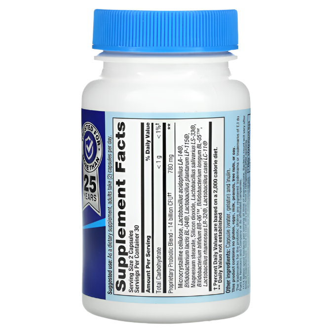 | Proprietary Probiotic Blend 14 billion CFU†† Microcrystalline cellulose, Lactobacillus acidophilus LA-14®, Bifidobacterium lactis BL-04®, Lactobacillus plantarum LP-115®, Magnesium stearate, Silicon dioxide, Lactobacillus salivarius LS-33®, Bifidobacterium bifidum BB-06™, Bifidobacterium longum BL-05™, Lactobacillus rhamnosus LR-32®, Lactobacillus casei LC-11® |
