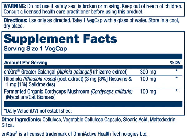 - Contains 300 mg of clinically backed enXtra® Alpinia Galangal—observed to sharpen alertness and focus for up to 5 hours*†